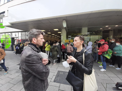 Nataliia Gorodovych, die gemeinsam mit Vita Danylenko aus Odessa den „Shop“ betreibt, ist ebenfalls tief beeindruckt. „Ich bin jeden Tag wieder aufs Neue berührt, wie viel uns gebracht wird. Es ist fast wie ein Wunder. Am Abend ist nichts mehr da, in der Früh ist aber wieder genug da. Oft genügt ein Facebook-Aufruf, und wieder sind zwei Tonnen Kartoffel, Milch, Zucker, Öl und Mehr da. Die Oberösterreicher sind sehr ausdauernd und großzügig. Das hilft uns Ukrainern und das gibt uns Mut. Ich habe z.B. Rudi aus Steyr kennengelernt, der schon 10x oder so da war und uns Nahrungsmittel im Wert von 9.000 € gebracht hat. Auch darum arbeite ich so gerne bei SUNUA mit, weil ordentlich was weitergeht und wir wirklich helfen können. Und es ist auch sehr lustig, wir sind ein bunt gemischtes österreichisch-ukrainisches Team und blödeln und lachen auch viel. Das lenkt mich ab vom Terror in meiner Heimatstadt Kharkiv.“